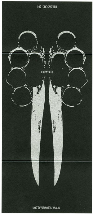 in metallic silver ink on matte black paper. The cover art is fucking awesome. Very minimal, very effective: Two knives with brass knuckles